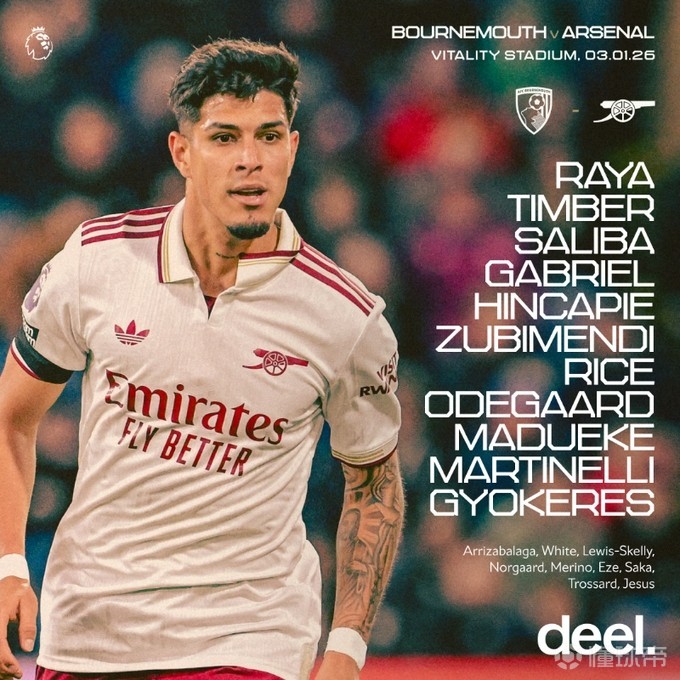 阿森納客戰伯恩茅斯:哲凱賴什、馬丁內利首發,塞門約出戰