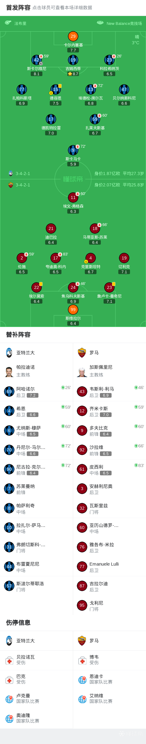 亞特蘭大vs羅馬:斯卡馬卡、科拉希納茨首發(fā),迪巴拉、克里斯坦特出戰(zhàn)